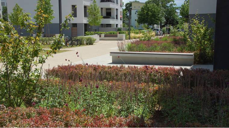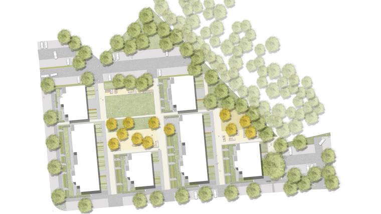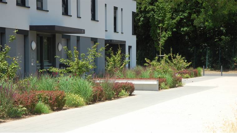 Neubau eines Wohnclusters im stark durchgrünten Wohnquartier Martin – Luther-King Park (Konversionsfläche). Schaffung von gemeinschaftlichen Grünflächen mit einem gemeinsamen Quartiersplatz. Klare Zonierung in Mietergärten und öffentlich zugängliche Freiräume durch Gestaltung mit variierenden Pflanzstrukturen aus Hecken, Stauden und Belagsbänderungen.Der Quartiersplatz und der Spielbereich werden aus eigens für das Projekt konzipierten, raumwirksamen Sitzmöbeln bespielt. Betonstege führen über Versickerungsmulden zu den Mietergärten. Die einzelnen Bauabschnitte werden durch ein Belagsband gerahmt und bilden eigene grünumspülte Cluster. Die Müllstellplätze wurden als einheitliche ‚Infrastrukturbänder‘ aus Sichtbeton und Holzlamellen in die Architektursprache der Neubauten integriert.