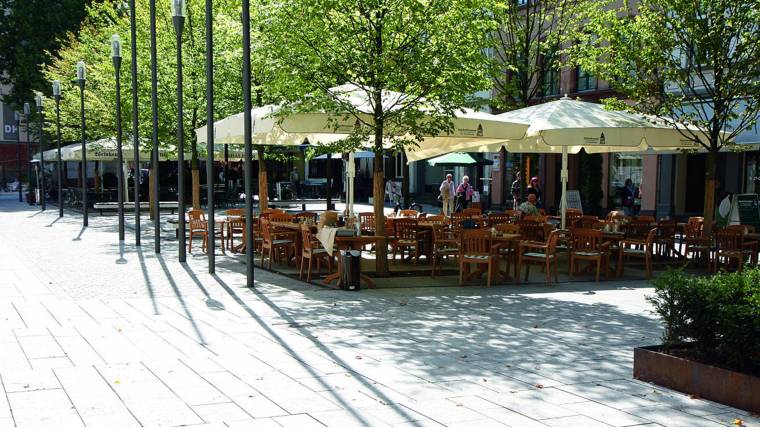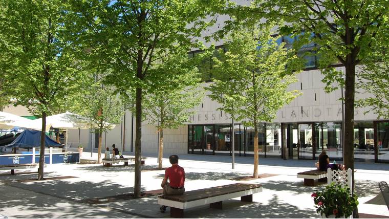 Durch den Rücksprung des neuen Plenarsaals konnte zu dem Fußgängerbereich der Grabenstraße der Parlamentsplatz als öffentlicher Platz entwickelt werden, der mit einem Baumhain aus hochstämmigen Hainbuchen Aufenthaltsqualität schafft. Dort haben sich mehrere Außengastronomien etabliert können.