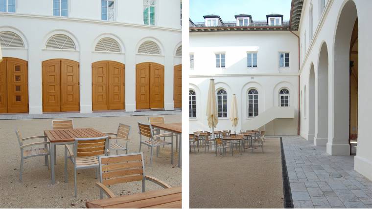 Die Materialität des neuen Plenarsaals wurde bei den Belägen des Parlamentsplatzes und den weiteren Freiflächen des Landstags (Kavaliershof, Innenhof) mit gesägten Muschelkalkplatten aufgegriffen.
