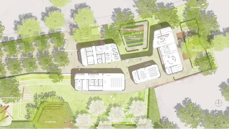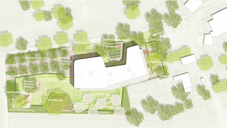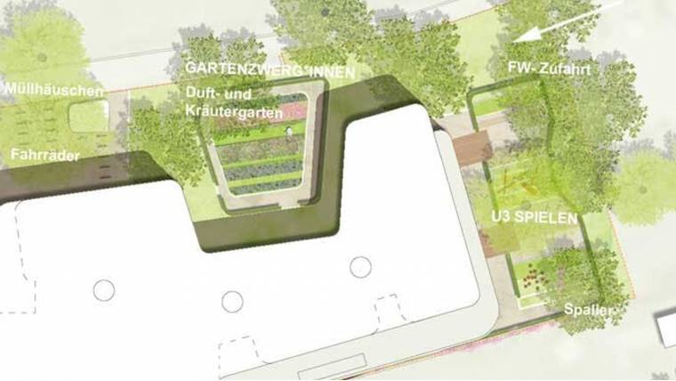 Durch die Lage des Neubaus und die Gliederung der Baukörper im Erdgeschoss können die kleinen, verbleibenden Flächen im Nordosten des Grundstücks effizient genutzt werden. So werden die unterschiedlichen Angebote und Funktionsbereiche wie U3-Spielen und der Zwergengarten (als Option nach Erwerb durch die Ortsgemeinde / Kräuter/Duftpflanzen/Gemüse) auf dem derzeit ausgesparten Grundstück im Nordosten flächensparend verortet.