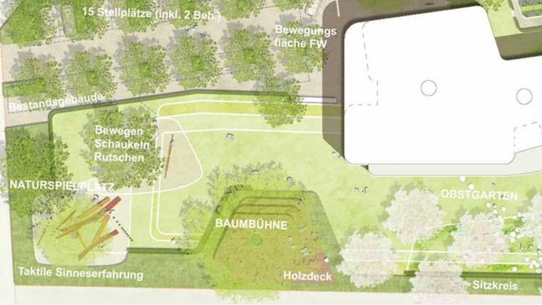 Gleichzeitig entsteht an der Südseite ein großzügiger Garten als Erlebnisraum mit starkem Bezug zur talseitigen Landschaft. Mit der Anordnung der verschiedenen Angebote entsteht ein angenehmer Spannungsbogen zwischen Weite und Dichte – Bewegung und Ruhe – Gemeinschaft und Rückzug. Unter den lichten Kronen eines Obsthains (Wahlweise Obst oder Zierobstarten) können sich die Gruppen zum Stuhlkreis zusammenfinden. Eine Baumbühne bietet im Schutz des großen Bestandsbaumes an der Südseite die Möglichkeit kleine Theaterstücke aufzuführen oder den Kindern das bunte Treiben wie von einer Tribüne aus zu beobachten. Die Holzkonstruktion der Bühne schützt die Baumwurzeln im Kronenbereich des Baumes vor Verdichtung und wird behutsam mit Erdschrauben verankert.