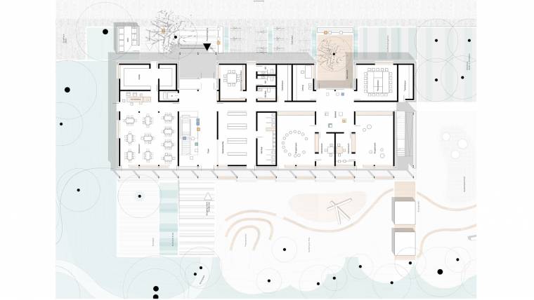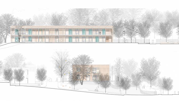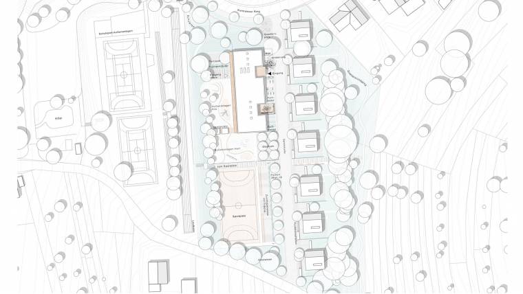 […] Am Übergang des Ortsrandes zur offenen Landschaft schlagen die Verfasser eine Neuordnung in klarer geometrischer Haltung eine Reihung von gut proportionierten EFH vor, die sich entlang der Hangkante bis zum Rainweg entwickeln. Der Freiraum zum Schulgelände wird in gleicher geometrischer Konsequenz mit Kita-Gebäude und Sportplatz räumlich ergänzt. Die neue Erschliessungstrasse zwischen der Wohnbebauung und der KITA liegt zwar topografisch richtig, kann jedoch als Lern- und Bewegungscampus nicht überzeugen. […] Positiv wird die neue Wegeverbindung vom Schulhof vorbei an den Freiflächen bis zum Rainweg gesehen. Dadurch ist nicht nur der Sportplatz für Schüler gut erreichbar, sondern kann auch als übergeordneter Fuß-und Radweg für das gesamte Wohnquartier dienen. Durch die Positionierung der KITA und des Sportfeldes kann nahezu der gesamte Baumbestand erhalten bleiben. […] Das Kitagebäude selbst wird als klarer zweigeschossiger Gebäuderiegel mit Ost-West Orientierung dispositioniert. Die architektonische Ausformung folgt der klaren städtebaulichen Haltung und ist pragmatisch. Über den Haupteingang an der Spielstrasse erreicht man barrierefrei das Foyer, von dort sind sowohl reizvolle Blicke zum Maintal über die Dachlandschaft von Sulzbach möglich, als auch zum Hort über das Galeriegeschoss. […] Im Hinblick auf die gestellte Aufgabe überzeugt der Entwurf vor allem durch seinen einfachen Umgang mit der neuen Bausubstanz und stellt einen wertvollen Beitrag im Stadtbild von Sulzbach dar. […]