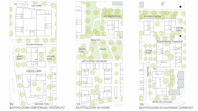 Entlang der Werftstraße bilden drei prägnante urbane Bausteine den Quartiersauftakt, wobei das zum Studentenwohnen umgebaute Hochhaus mit seinem von der Werftstraße zurückgesetzten Vorplatz den Hauptzugang und die Quartierszufahrt betont. Die beiden flankierenden Eckbausteine nehmen im Erdgeschoss gewerbliche Dienstleistungen und Serviceeinrichtungen auf, das Baufeld des Ideenteils den Lidl-Markt sowie weitere Läden und Serviceeinrichtungen. Die zur Werftstraße orientierten Obergeschosse sind mit Lärmschutzfassaden (Loggien) auf lärmabgeschirmte Innenhöfe orientiert sowohl für Büros wie auch für Wohnen geeignet.