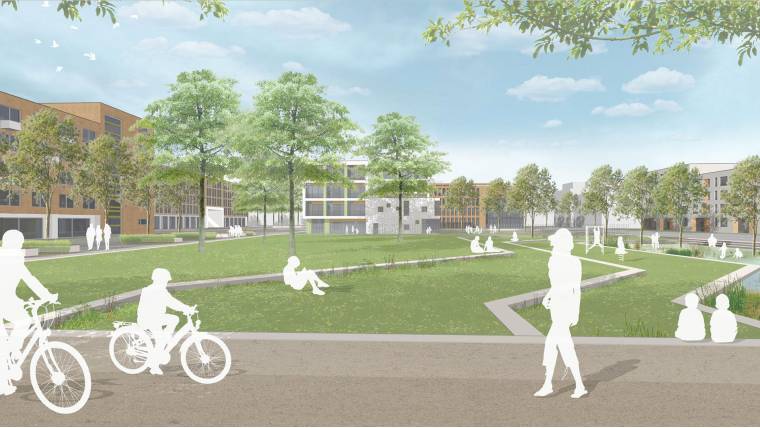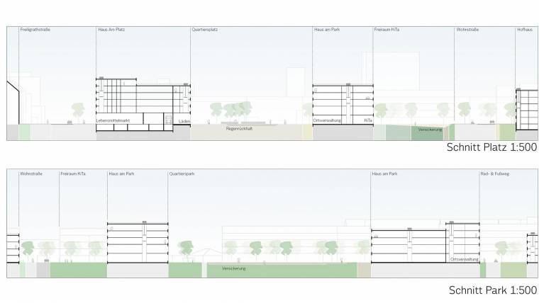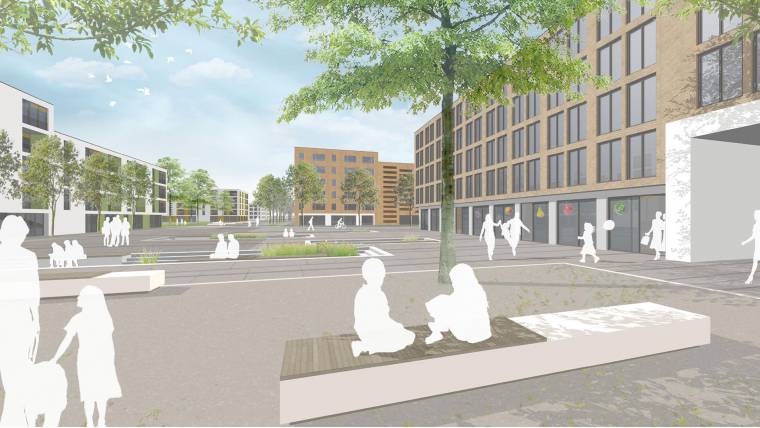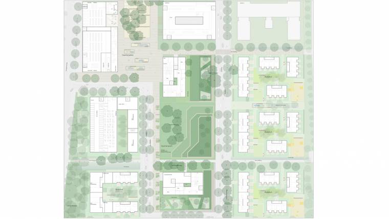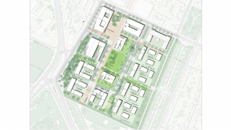 […] Ein vergleichsweise groß dimensionierter Quartiersplatz öffnet sich zur Straße „An der Goldgrube“ und bezieht dabei einige bestehende Bäume mit ein. Auch entlang der Freiligrathstraße wird durch ein Zurückweichen der Bebauung der Erhalt von bestehenden Baumstandorten ermöglicht.